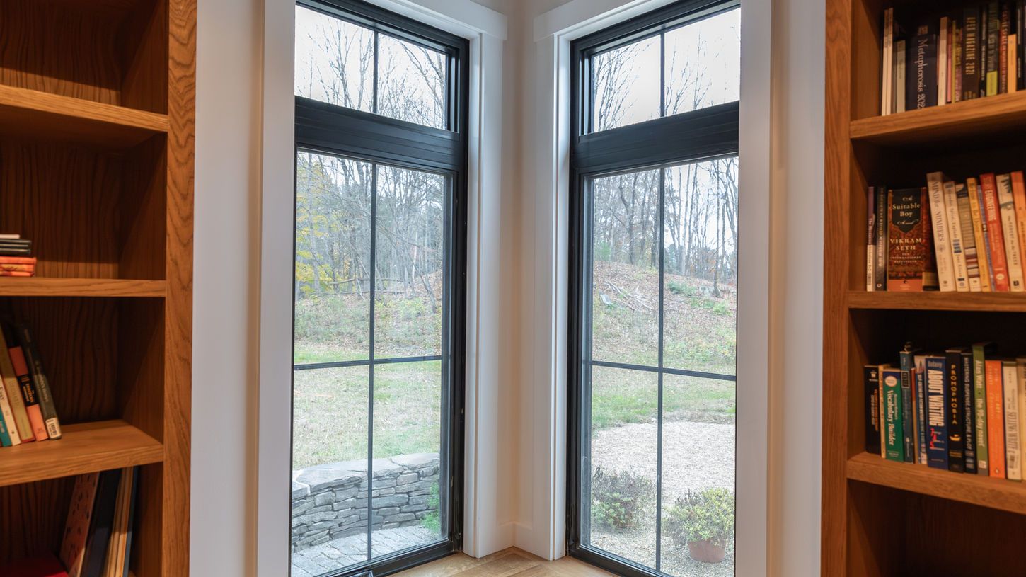 This custom library was designed to perfectly fit a distinctive space connecting an addition and the existing house. Floor-to-ceiling white oak bookshelves finished in dark tung oil anchor the room, providing both warmth and sophistication. Integrated features include custom window seats with built-in storage, outlets discreetly installed along the baseboards, and an electric toe-kick heater for comfort. Electrical switches and outlets were seamlessly incorporated into the millwork for a clean, tailored look. Completing the design is a custom white oak rolling library ladder on a metal track, offering both function and charm.